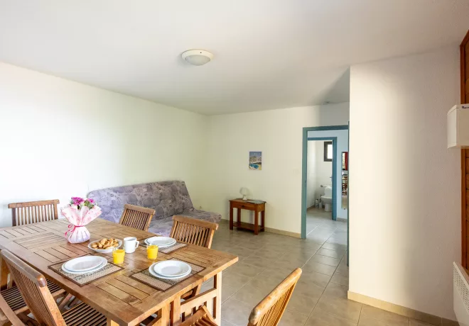 Appartement 6 personnes Séjour (convertible). 2 chambres (lits simples). Cuisine. Salle d’eau. WC. Terrasse.