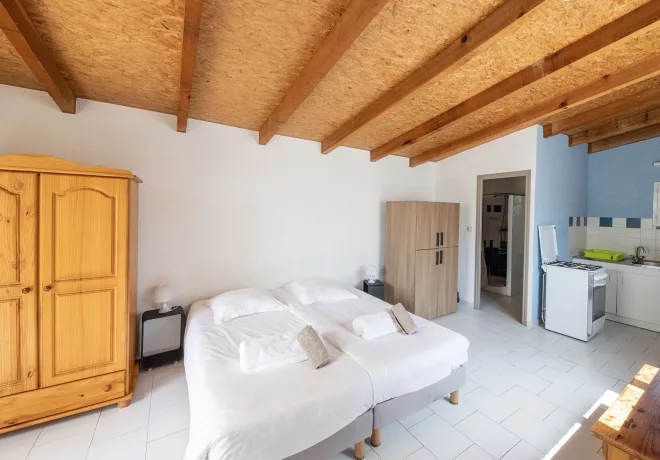Studio 3 personnes Lits simples, fauteuil convertible. Salle d’eau, WC. Cuisine. Terrasse.
