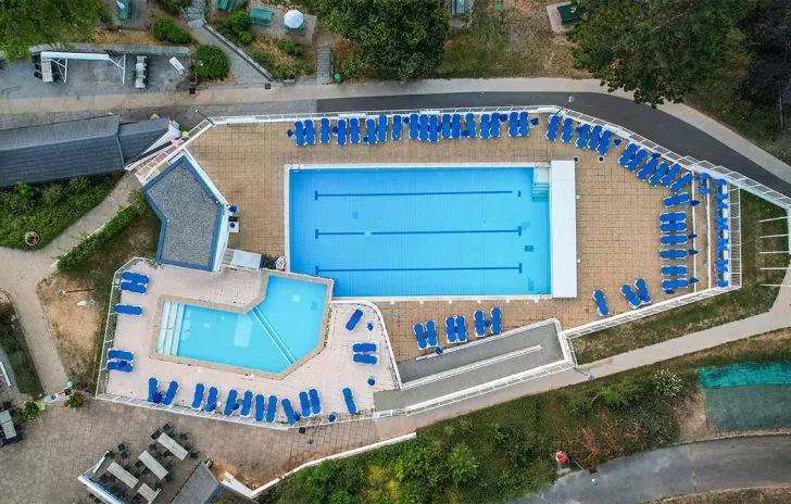 Equipements à disposition : Piscine extérieure chauffée (dimension 10 m/20 m, profondeur 1,30 m à 2,50 m) et bassin enfants séparé (dimension 6 m/10 m, profondeur 0,45 m à 0,80 m), avec transats et parasols.