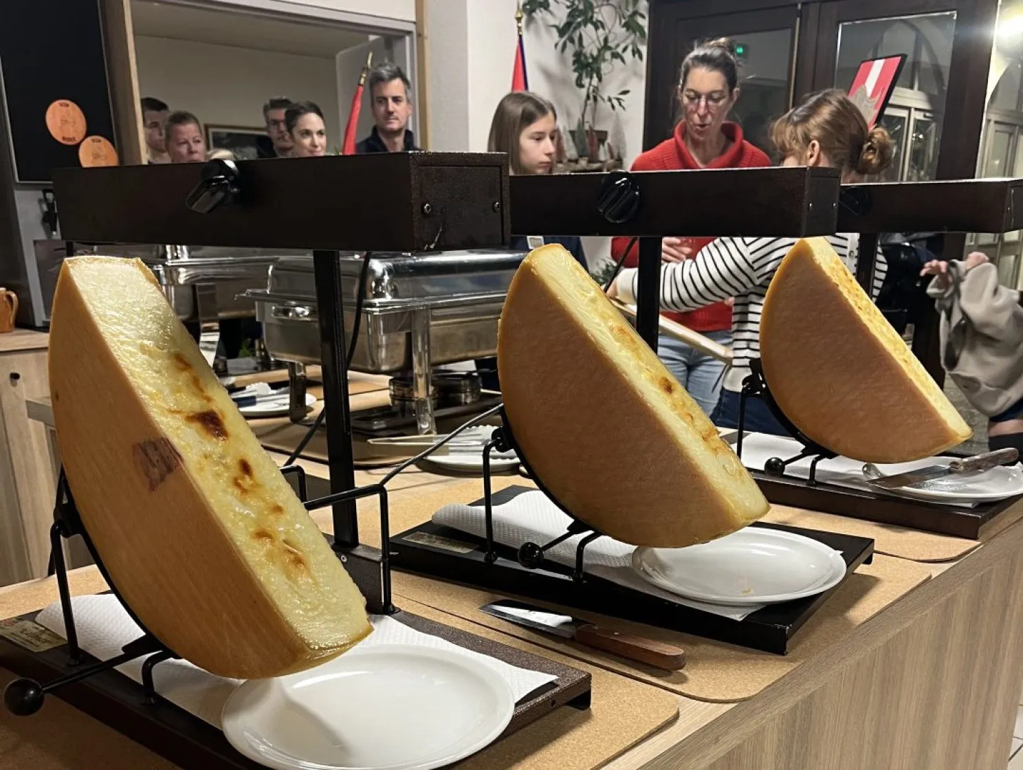 Disposition sur la table : Installer l’appareil à raclette (gril ou demi-meule selon le style). Chaque convive fait fondre sa portion de fromage dans un poêlon et la verse sur ses pommes de terre.