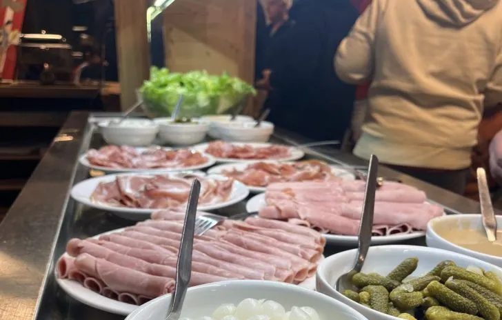Préparer les accompagnements : Disposez sur une grande planche ou plusieurs assiettes : Les tranches de fromage – Les charcuteries – Les condiments (cornichons, oignons) – La salade éventuellement assaisonnée
