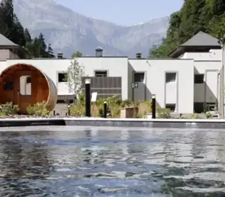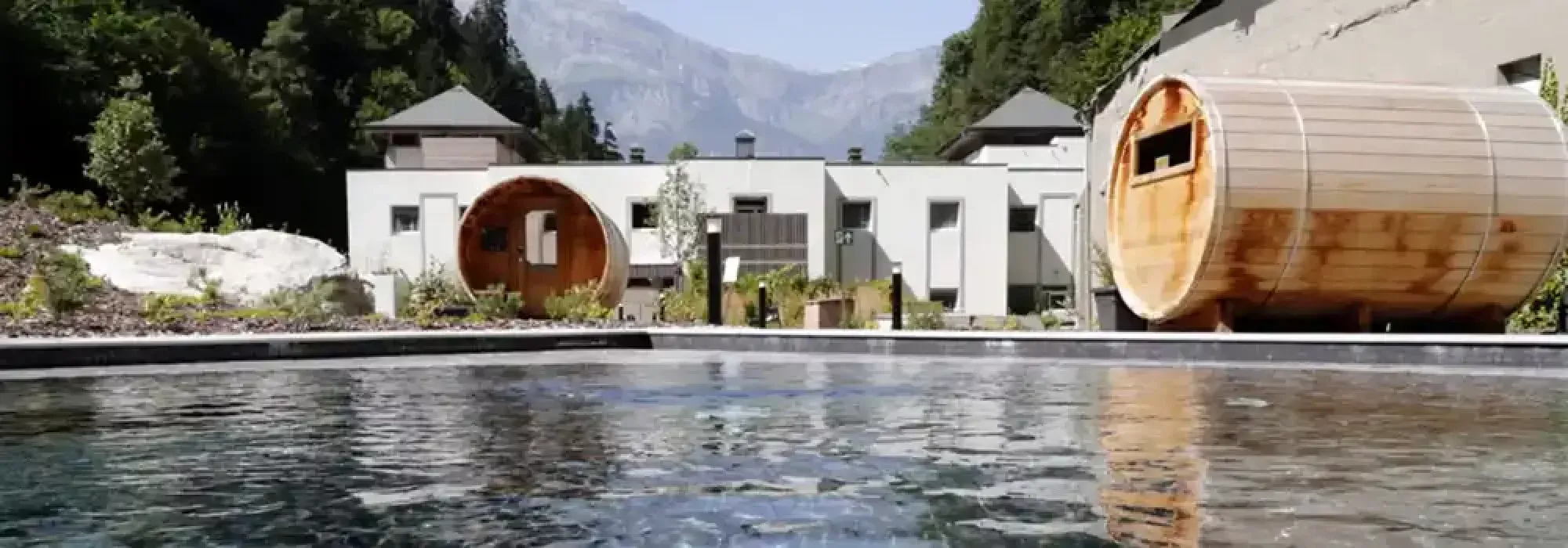 Un spa thermal moderne et lumineux avec vue sur les montagnes : bassins d’eau chaude, hammams, saunas, tisanerie…
